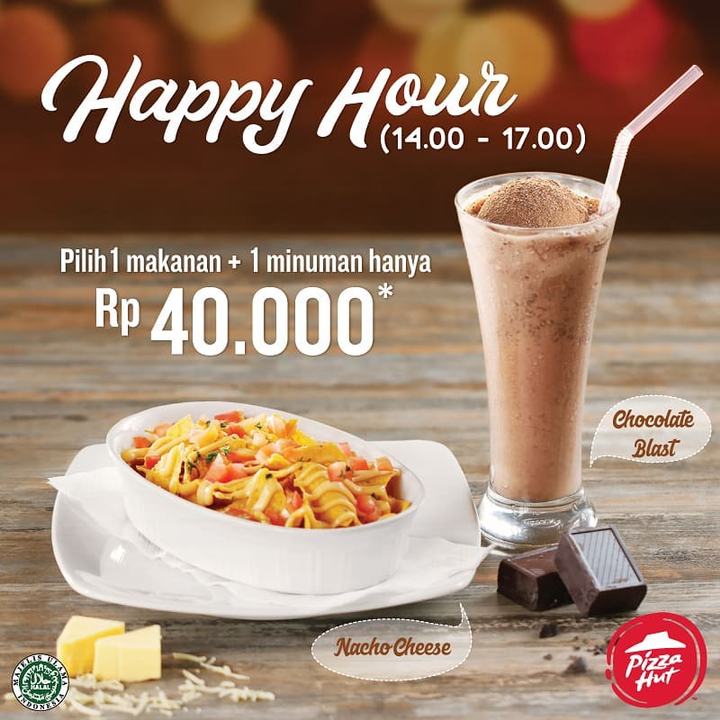 Ngobrol bareng teman pasti lebih asik nih kalau sambil ngemil Nacho Cheese dan Chocolate Blast di Pizza Hut! Yuk, nikmati promo Happy Hour dari Pizza Hut dari jam 2 sampai jam 5 sore. Lumayan kan?