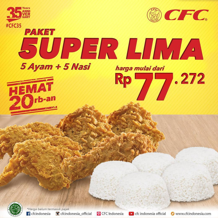 Mau makan rame-rame tapi tetap hemat? Ada paket Super Lima, lho, dari CFC. Harganya mulai dari Rp 77.272 sudah dapat 5 ayam dan 5 nasi. Yuk, buruan ajak teman-teman makan di CFC!