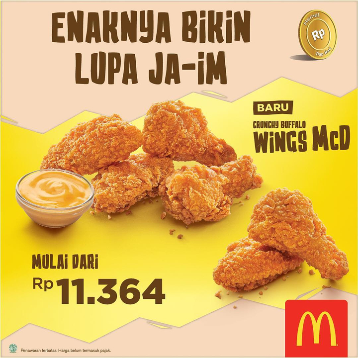 McDonald's punya menu baru yang enaknya bikin lupa jaim. Kamu bisa dapetin Crunchy Buffalo Wings seharga Rp 11,364 per ayamnya. Kalau kamu beli 4 pcs, kamu bisa dapetin saus Nacho Cheese atau Garlic Butter yang bikin sesi makan makin komplit!