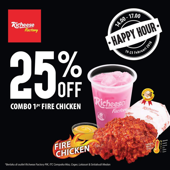 Richeese Factory bagi-bagi diskon nih! Untuk setiap pembelian menu Combo 1 Fire Chicken, kamu bisa langsung dapetin diskon 25%. Promo diskon bisa kamu nikmati sampai tanggal 23 Februari 2018 mulai dari jam 2 siang sampai jam 5 sore.