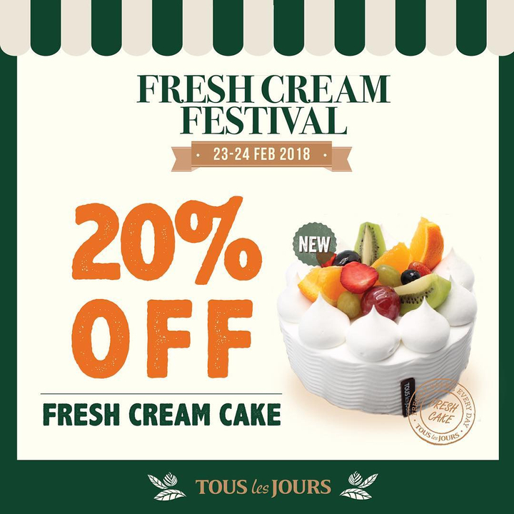 Siapa nih yang suka beli Fresh Cream Cake dari Tous Les Jours? Khusus di tanggal 23 - 24 Februari 2018, ada potongan 20% harga Fresh Cream Cakenya dari Tous Les Jours. Tunggu apa lagi?