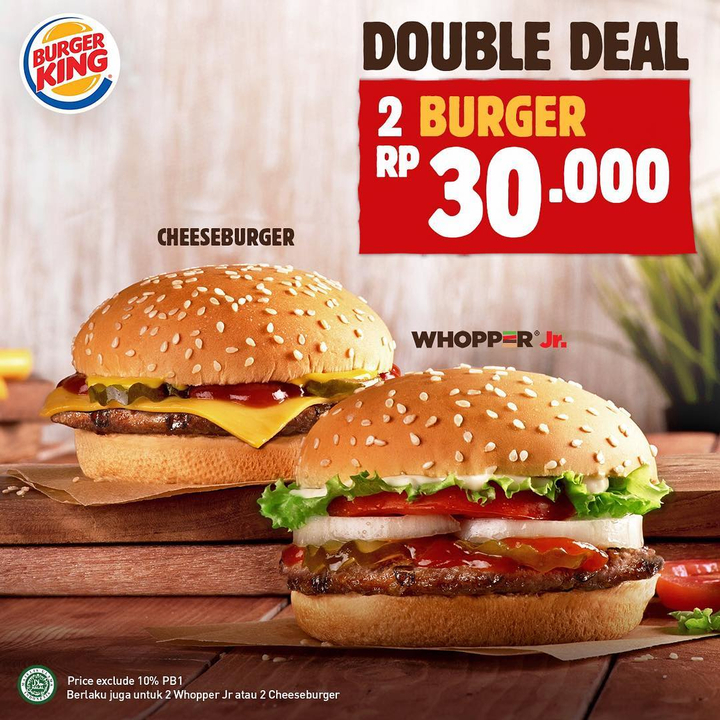 Emang deh, Burger King penyelamat di tanggal tua banget! Nikmati 2 burger paling favorit yaitu Cheeseburger & Whopper Jr. cuma dengan Rp 30 ribuan! Terjangkau banget, kan? Jangan sampai kelewatan ya guys!