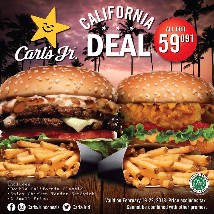 Carl's Jr. CALIFORNIA DEAL balik lagi nih! Double California Classic, Spicy Chicken Tender Sandwich and 2 Fries hanya seharga Rp. 59,091. Berlaku sampai dengan hari ini aja guys, khusus dine-in, take away, dan pemesanan melalui GOFOOD. Buruan, jangan sampai kelewatan!