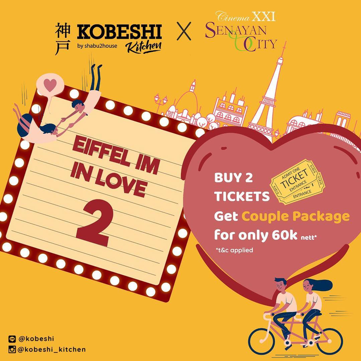 Bulan Februari masih terasa nih momen Valentinenya. Apalagi Kobeshi Kitchen bagi-bagi Couple Voucher dengan beli 2 tiket Eiffel I'm In Love 2 di XXI Senayan City dan kamu akan dapat Couple Package cuma dengan Rp 60 ribu. Ajak pasanganmu ke Kobeshi Kitchen, ya!
