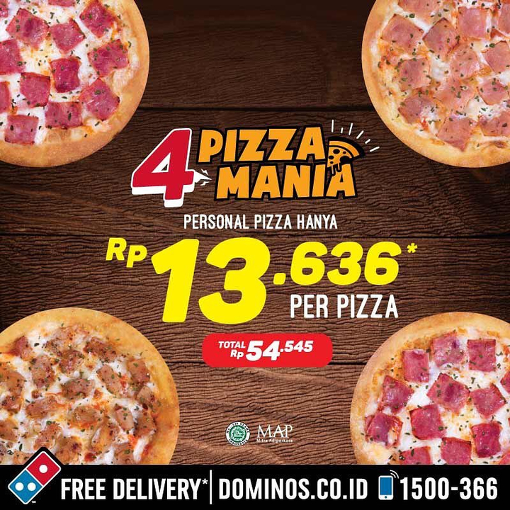 Pecinta Domino's Pizza mana nih suaranya? Ada Best Deal yang bisa kamu nikmati bareng teman-temanmu nih. 4 Pizza Mania cuma seharga Rp 54 ribuan! Berarti kamu cuma perlu bayar Rp 13 ribuan per orangnya. Yuk, ke Domino's Pizza!